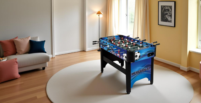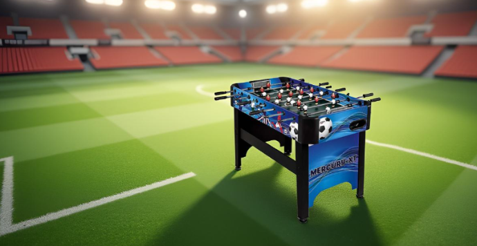 Der Carromco Kicker Mercury-XT ist der ideale Kickertisch für Kinder und Jugendliche, die echten Fußballspaß zuhause erleben wollen. Mit seinem modernen Design in Blau-Schwarz und coolen Fußballmotiven fügt er sich perfekt in jedes Kinder- oder Jugendzimmer ein und sorgt für actionreiche Matches mit Freunden und Familie.